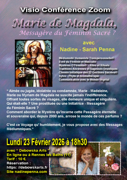 Tout 6 /Atelier 1 /Danse - Mouvement 0 /Féminin Sacré 0 /Formation 1 /Marie- Madeleine - Myriam de Magdala 0 /Méditation 0 /Messages 5 /Non classé 1 /Onctions Sacrées " La Magdaléenne 0 /Parfum des Onctions Sacrées 0 /Pélerinage 0 /Rituel 4 /Sexualité Sacrée 0 /Stage 1 /Voyage au coeur de Soi 4 /Voyage en Conscience 0 /Voyage initiatique 1
