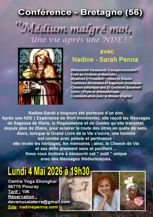 Bretagne – Conférence lundi 4 Mai : “ Médium malgré moi, une vie après une NDE ! » & Séances Individuelles