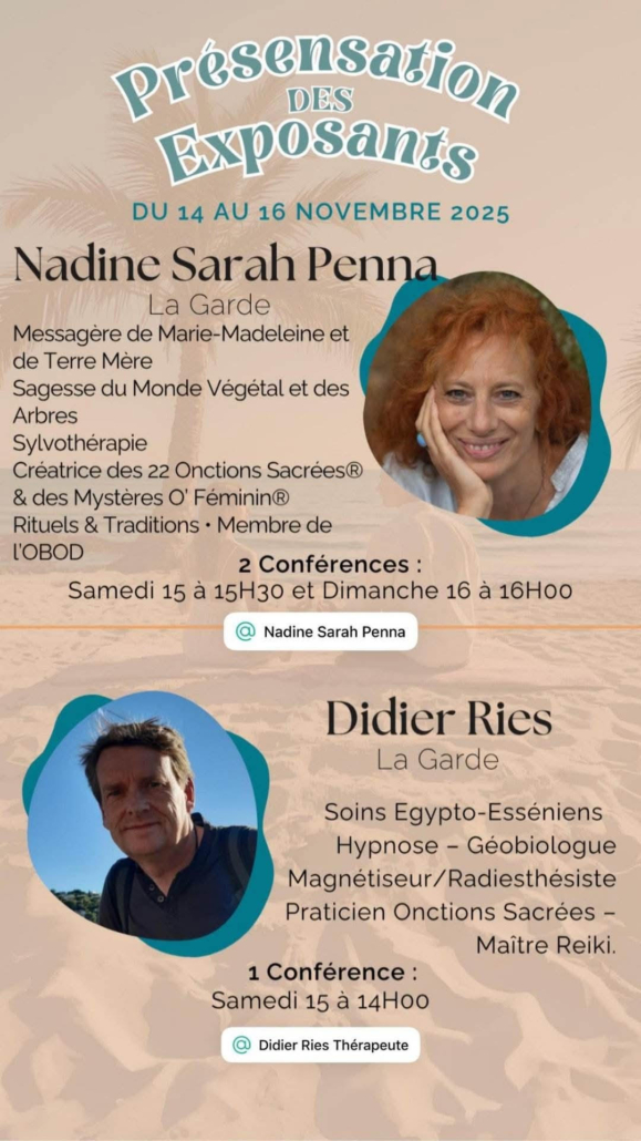 “ Nadine-Sarah a toujours été porteuse d’un don ; après une NDE, Elle reçoit les Messages de Sagesse de Myriam, la Magdaléenne qu’elle transmet, depuis plus de 25ans, pour éclairer la route des êtres en quête de sens. Nous vous invitons à découvrir comment et » outil » unique avec des Messages Médiumniques.